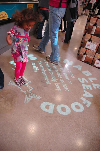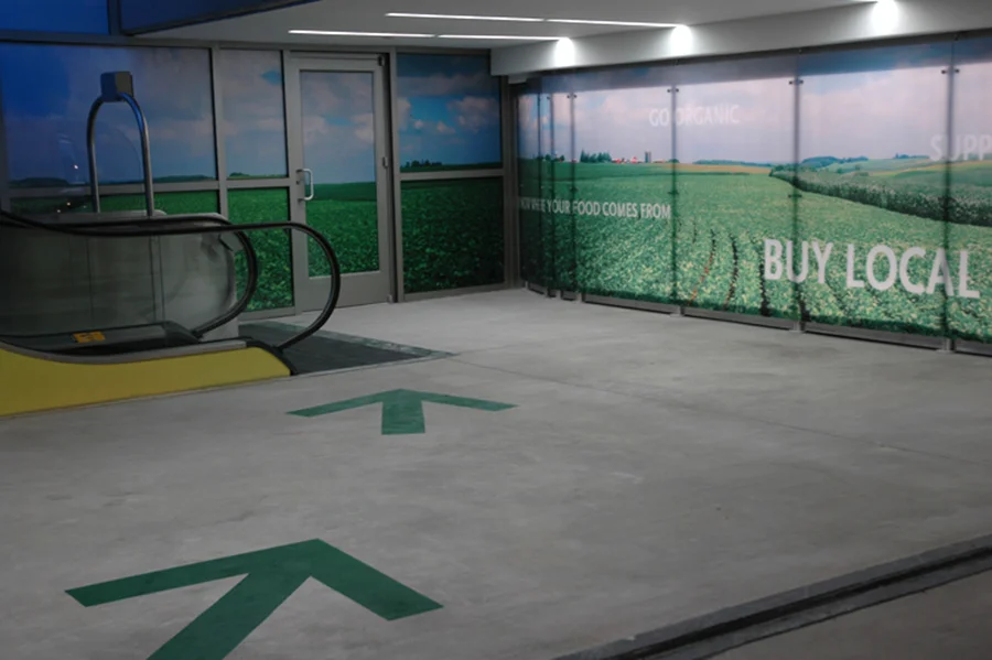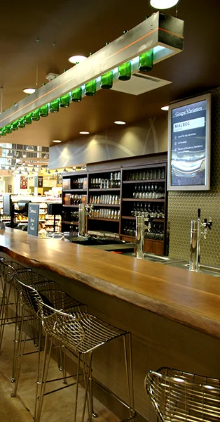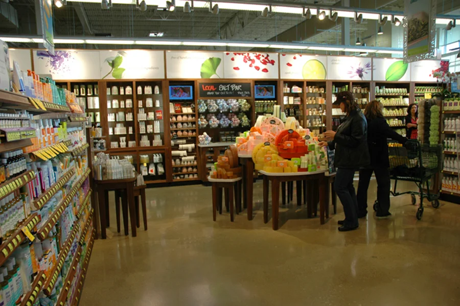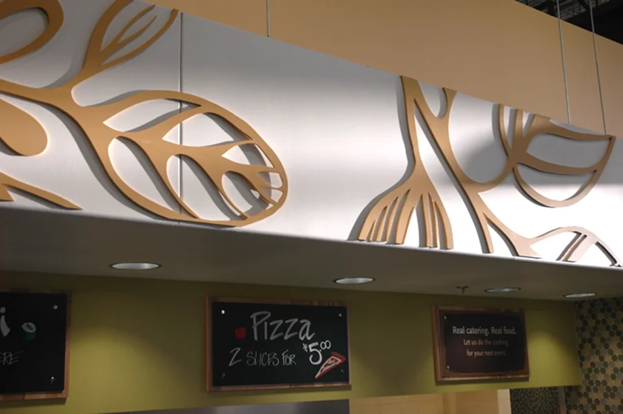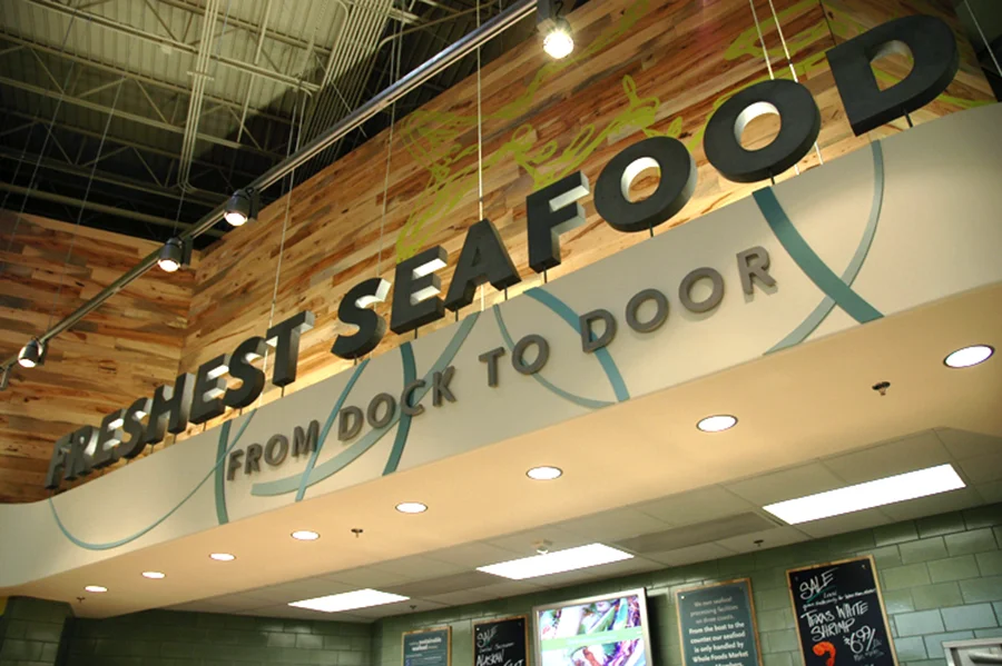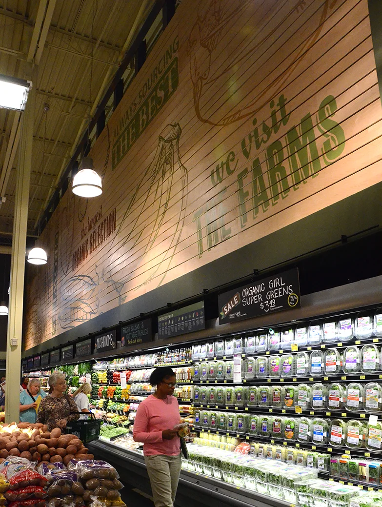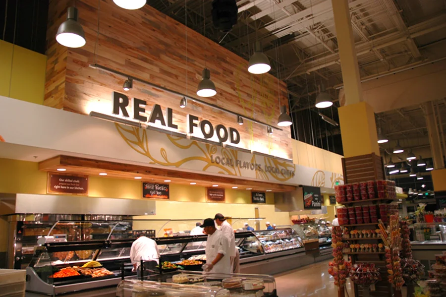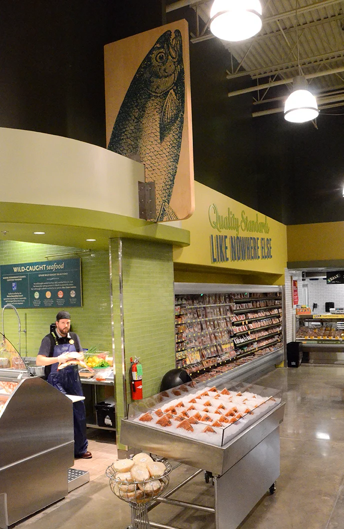 A store interior designed to introduce a new market to the core values and standards of Whole Foods Market, all while working within a smaller budget than most store interior packages. Designs feature simplified color palette, cookie sheet vertical wall treatment, punchy colors and large, graphic plywood elements.